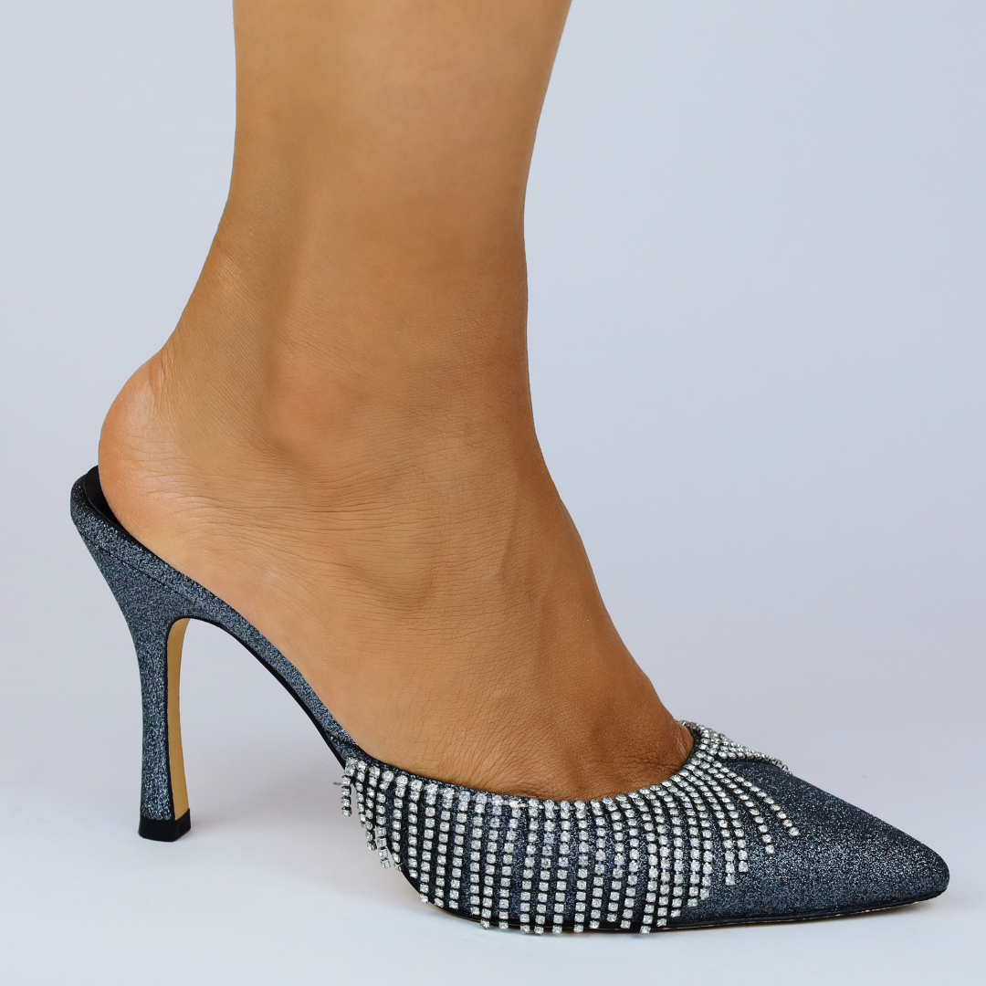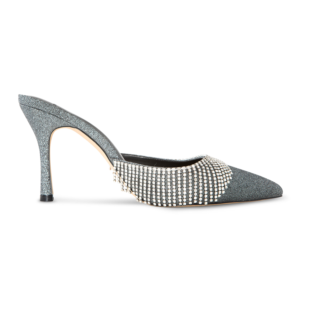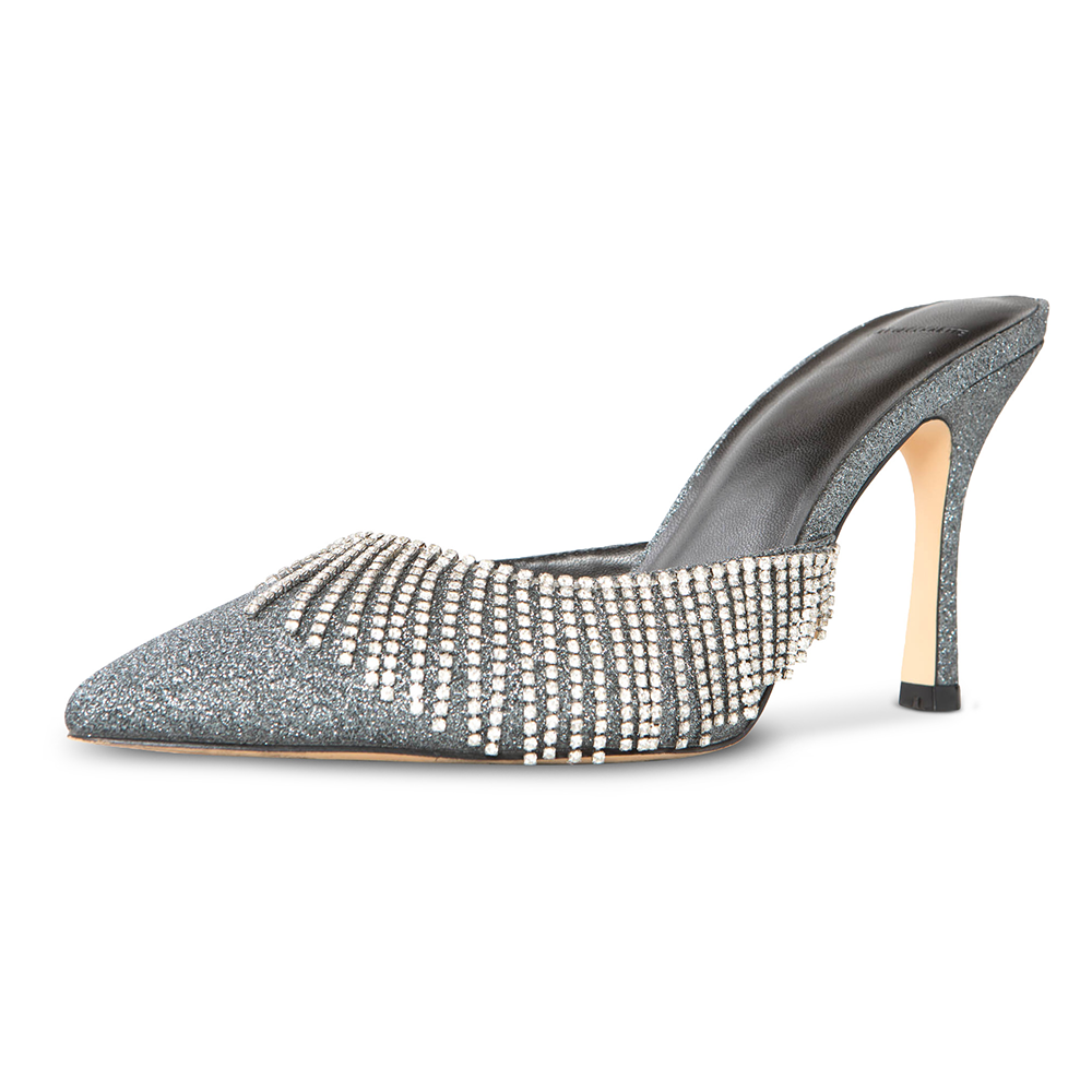 Introducing 'Catherine Pewter' vegan mule. The season's "it" shoe with a cruelty-free twist. Our 'Catherine' mules feature a sparkly pewter finish, detailed with dangling rhinestone fringe.Â