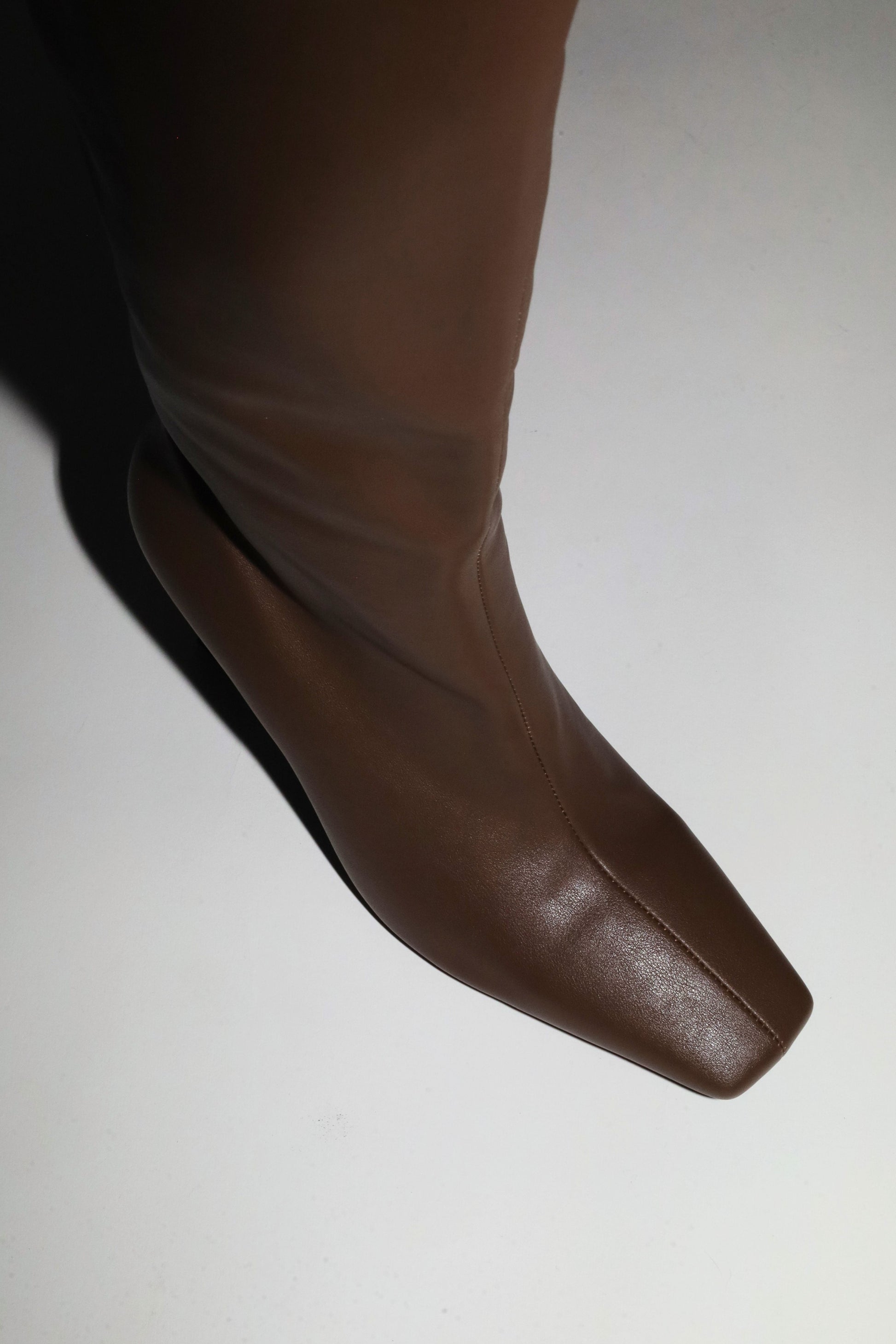 The elongated silhouette, sharp square toe, and subtly flared heel create a modern, architectural shape — effortless, minimal, and endlessly wearable. She’s the boot you reach for when you want to look put-together without overthinking it.